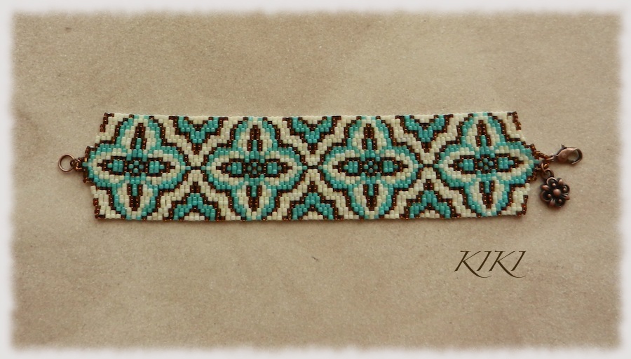 Ennek a karkötőnek a mintáját a netről olyan régen mentettem le, hogy már azt se tudom honnan származik. (nem bánom, ha aki tudja, megírja) Csak várta a sorát, de most újra rábukkantam és végre elkészült. Egyik kedvenc színkombinációmhoz nyúltam, krém-türkiz-bronz, és ez az első három szemes peyote-tal készült karkötőm.